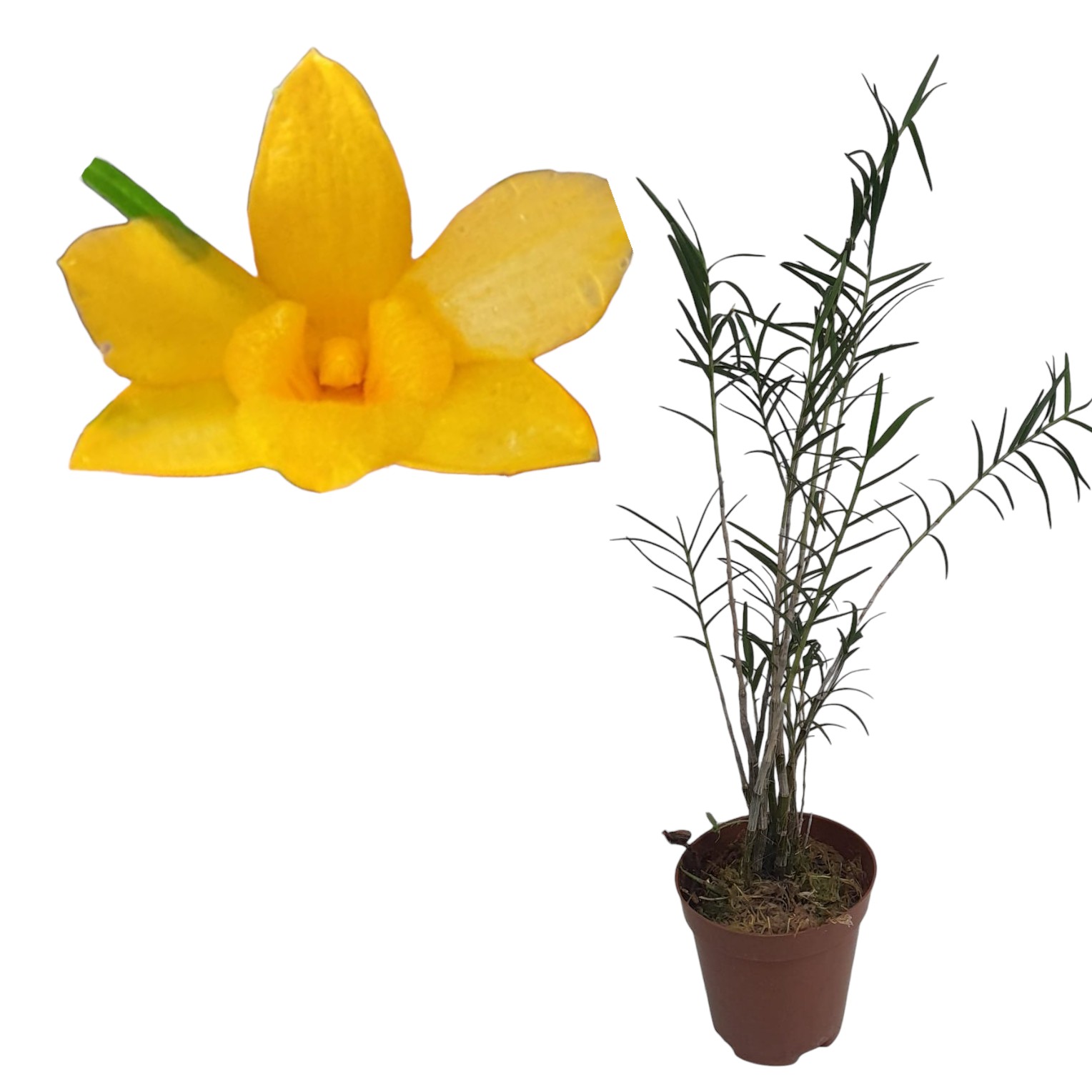 A Dendrobium hancockii é uma orquídea de médio porte originária da China, conhecida por suas flores amarelas vibrantes.