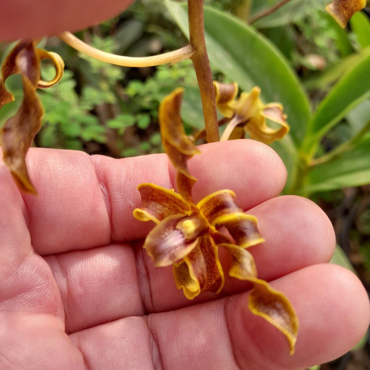 Flores: são de tamanho médio, com pétalas e sépalas que assumem uma forma espiralada, criando um visual escultural e exótico. As hastes florais são finas e eretas, sustentando diversas flores ao longo de sua extensão.