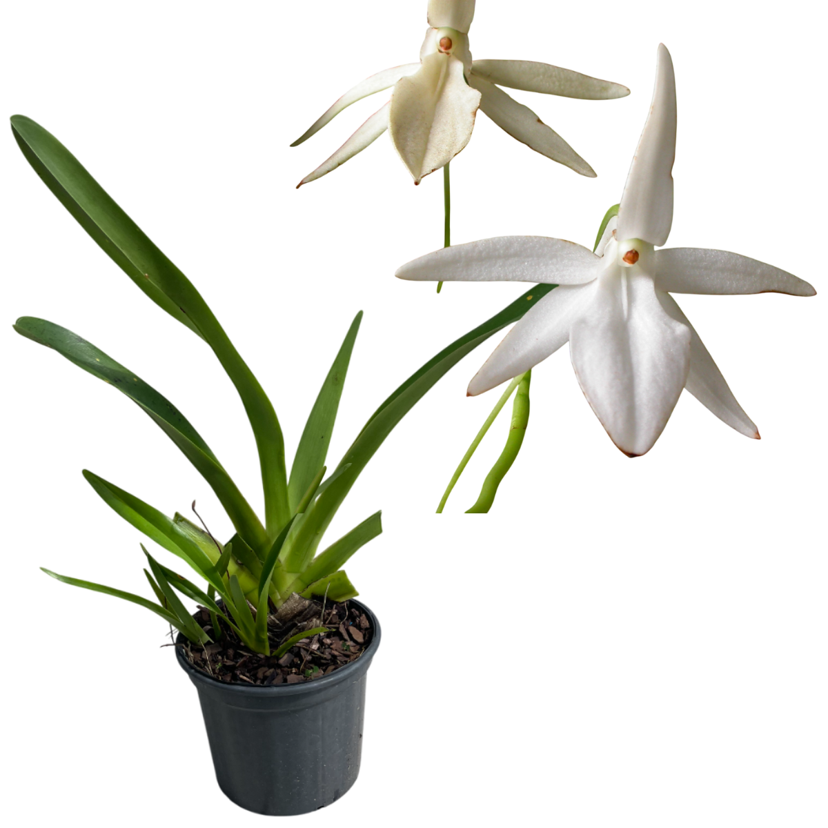 A Jumellea sagittata é uma orquídea epífita originária de Madagascar, conhecida por suas flores brancas de aparência cerosa e perfume adocicado. Ideal para colecionadores e amantes de orquídeas exóticas.